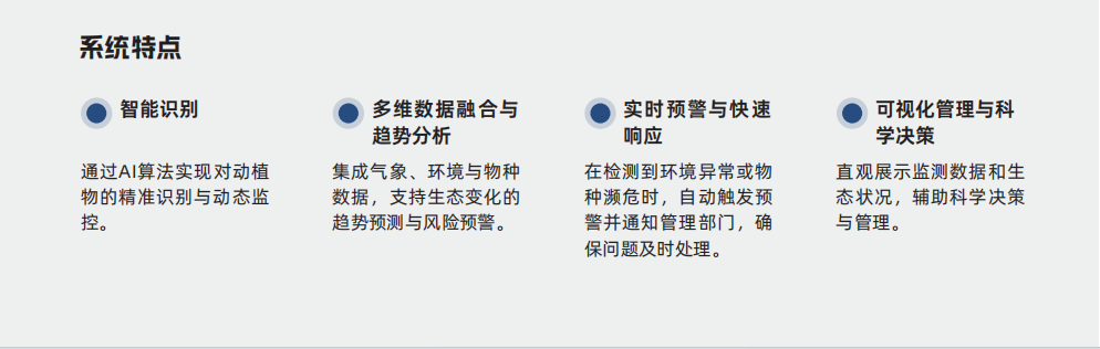 1、智能识别:通过AI算法实现对动植物的精准识别与动态监控。