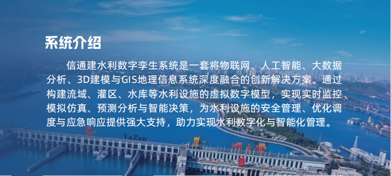 信通建水利数字孪生系统是一套将物联网、人工智能、大数据分析、3D建模与GIS地理信息系统深度融合的创新解决方案。通过构建流域、灌区、水库等水利设施的虚拟数字模型,实现实时监控模拟仿真、预测分析与智能决策,为水利设施的安全管理、优化调度与应急响应提供强大支持,助力实现水利数字化与智能化管理。